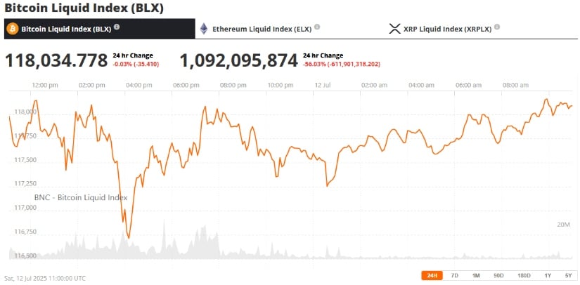 Bitcoin (BTC) was trading at around $118,034 at press time. Source: Bitcoin Liquid Index (BLX) via Brave New Coin