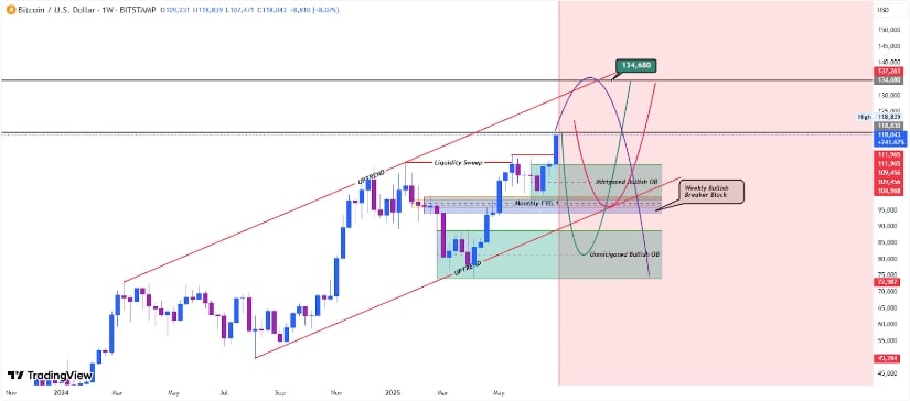Bitcoin’s weekly chart suggests continued upside potential, but a candle close above $118,900 is needed to confirm the next leg of the rally. Source: Olajireolapoju On TradingView