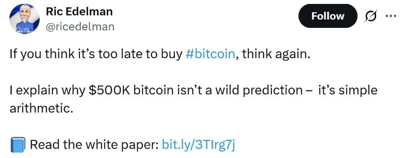 Bitcoin reaching $500,000 is a plausible scenario based on straightforward arithmetic and market dynamics. Source: Ric Edelman via X
