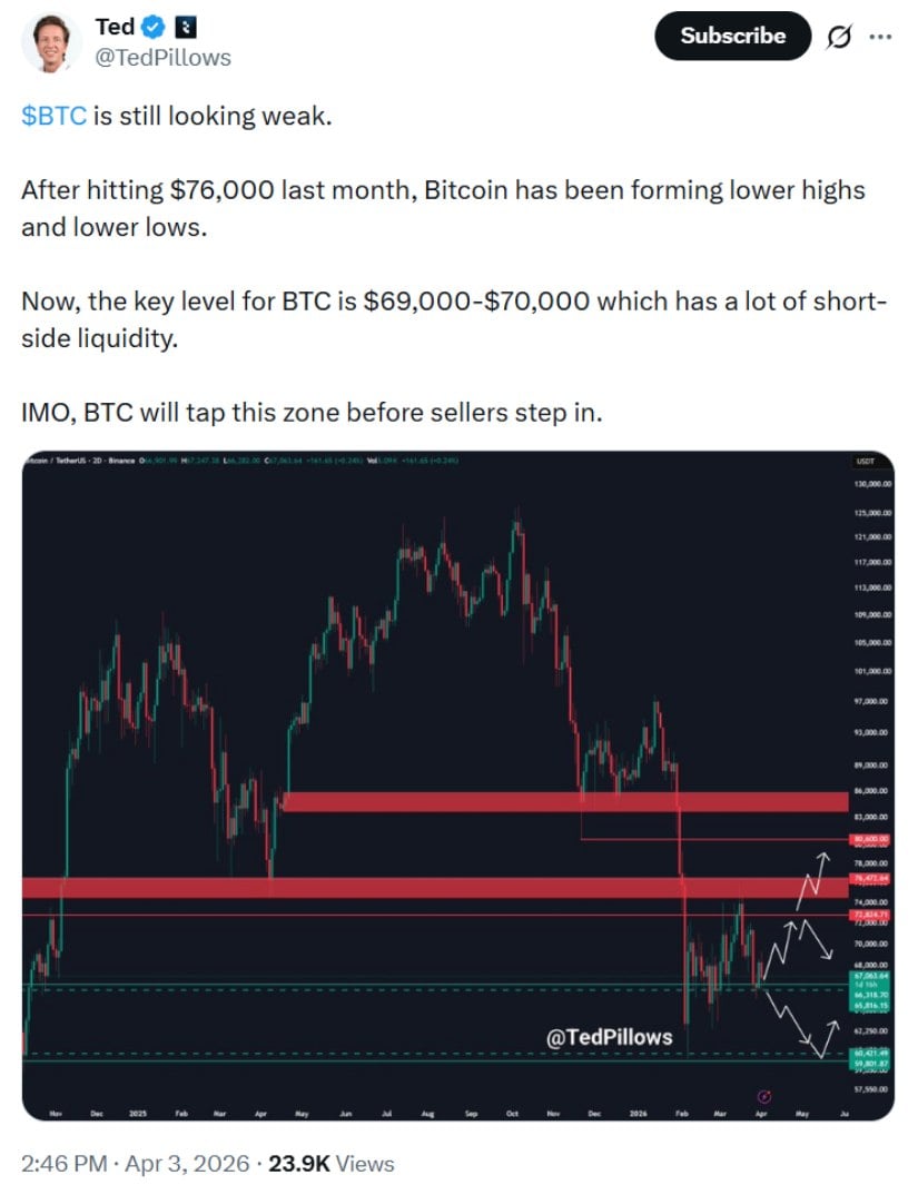 From a broader perspective, market analyst Ted Pillows described Bitcoin’s structure as “technically weak,” citing a pattern of lower highs and lower lows since its March peak near $76,000. He also pointed to the $69K–$70K zone as a liquidity target, suggesting that price could revisit this area before determining its next direction.