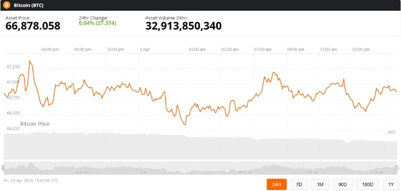 Bitcoin (BTC) is trading at around $66,878, up 0.04% in the last 24 hours at press time. Source: Bitcoin price via Brave New Coin