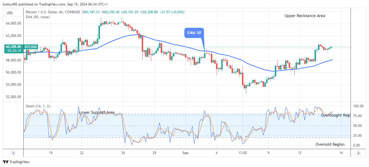 As a result of price rejection at the $59,825 high mark in the previous action, buyers pushed the price of Bitcoin higher amid rising demand to a $60,208 supply level above the EMA-50, as the 4-hourly session opens today.