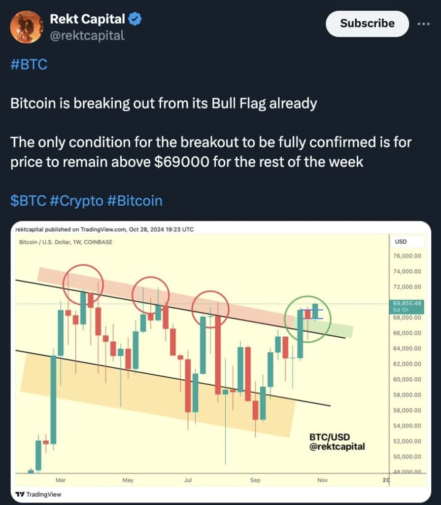 In the days ahead, key U.S. macroeconomic data, such as Q3 GDP, nonfarm payrolls, and the Personal Consumption Expenditures (PCE) index, will be released alongside critical events: the U.S. Presidential Election on Nov. 5 and a Federal Reserve meeting on Nov. 6. Both events are seen as pivotal for risk assets like crypto. CME Group’s FedWatch Tool indicates a 95.1% probability of a 0.25% rate cut, and as Rekt Capital describes, Bitcoin’s recent weekly close of $67,940 on Bitstamp signals the “most bullish” outcome possible, cementing what many hope will be the start of a significant new uptrend.