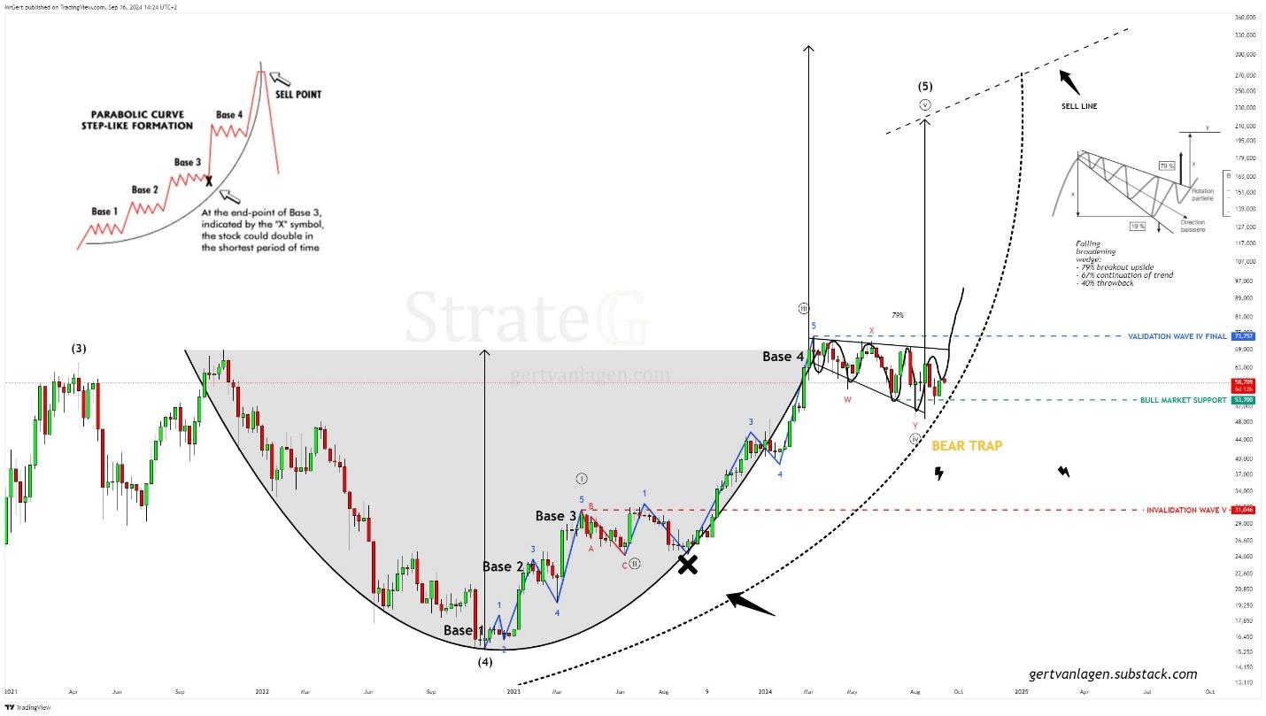 “BTC [1W] Step-like formation Update: Bitcoin is forming an ascending broadening wedge at Base 4, which breaks to the upside 79% of the time. In 67% of cases, it’s a continuation pattern with an upward trend. Target zone ~$300K at the sell line,” van Lagen wrote.