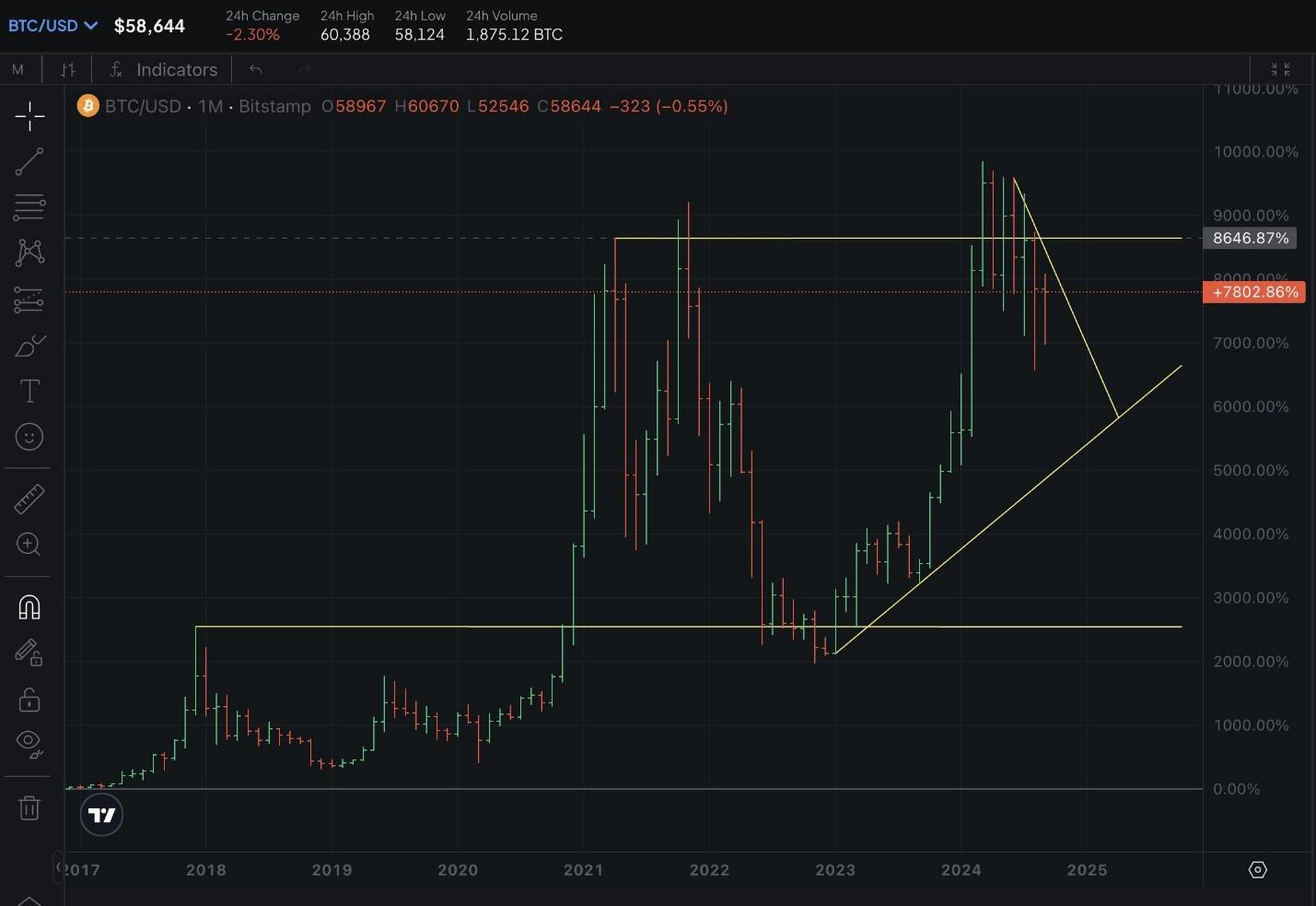 However, not all market participants share the bearish outlook. Prominent crypto analyst Gert van Lagen remains optimistic, pointing to Bitcoin’s much-discussed broadening wedge pattern as a signal for potential bullish momentum.