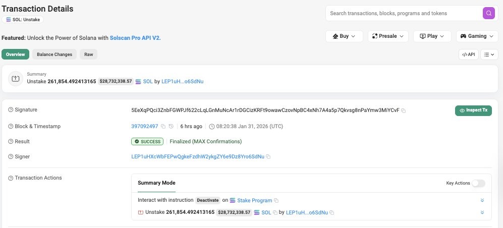 Onchain data reviewed by blockchain security firm CertiK shows that roughly 261,854 Solana (SOL) (worth around $27.2 million) was unstaked and transferred from Step Finance-controlled wallets.