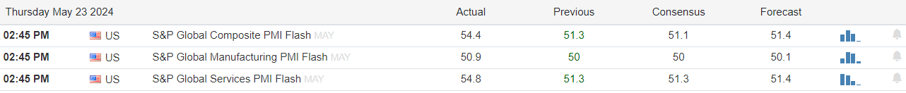 According to Trading Economics, the S&P Global US Composite PMI Flash experienced a significant surge in May, reaching 54.4, up from April’s 51.3. This marks the highest level since April 2022, surpassing the consensus expectation of 51.1. The manufacturing and services sectors exceeded predictions, with the Manufacturing PMI Flash at 50.9 against a consensus of 50 and the Services PMI Flash at 54.8, compared to the expected 51.3.
