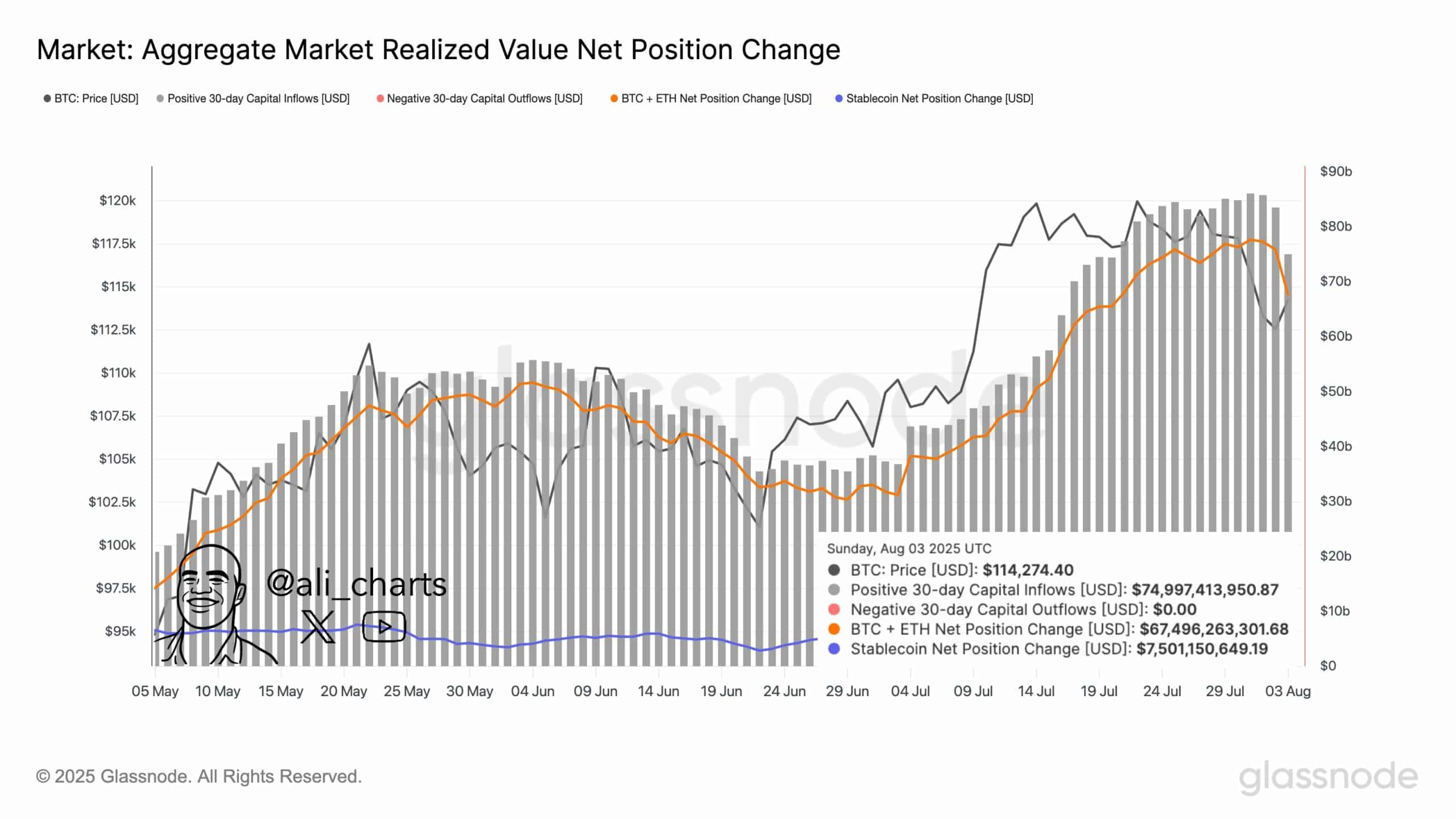With net inflows holding steady at $75 billion and BTC + ETH position changes remaining positive at over $67 billion, the market setup appears constructive rather than corrective.