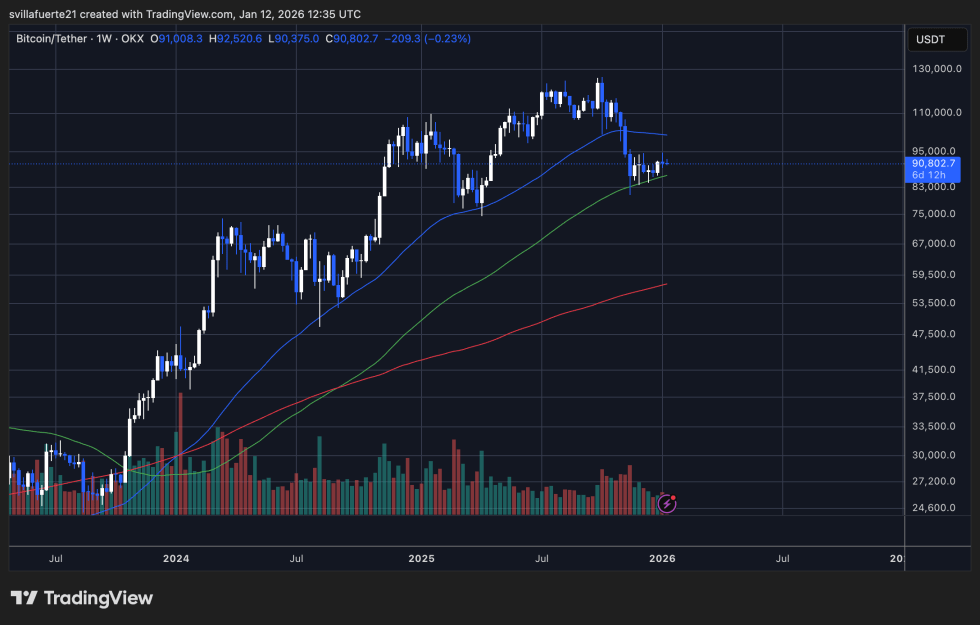 Bitcoin’s weekly chart shows a market locked in consolidation after a sharp correction from the October highs, with price currently hovering just above the $90,000 level. This zone has become a key pivot, acting as short-term support after BTC failed to hold above the $95,000–$100,000 region. The recent candles reflect indecision rather than strong directional conviction, consistent with a broader pause in momentum.