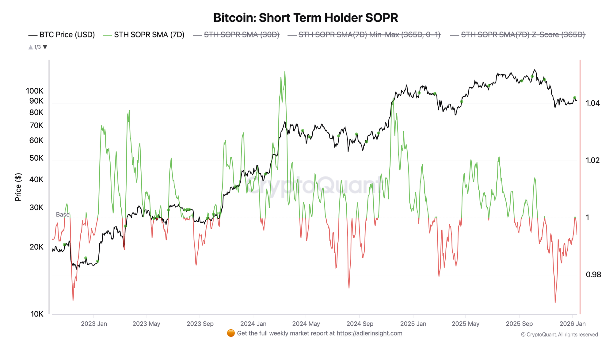 The latest on-chain update from Adler focuses on the behavior of short-term holders through the STH SOPR metric, which measures the ratio between the selling price and the acquisition price of coins that last moved within the past 155 days. When this indicator trades below 1.0, it means that short-term participants are, on average, realizing losses rather than profits.