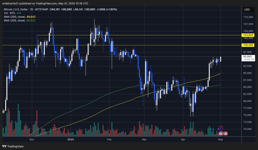 Bitcoin is trading above the $95,000 level as bulls try to reclaim control and push toward six figures. After a strong rebound from its April lows, BTC has entered a tight consolidation range between $92K and $96K, with market participants watching closely for a decisive breakout. A move above the $96K mark could trigger the next leg up, potentially opening the door to a test of the long-awaited $100K milestone.