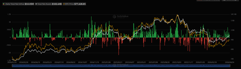 Together, those figures pushed total Bitcoin ETF assets from $86 billion at the start of the month to $102 billion by April 24, according to data tracked by SoSoValue.