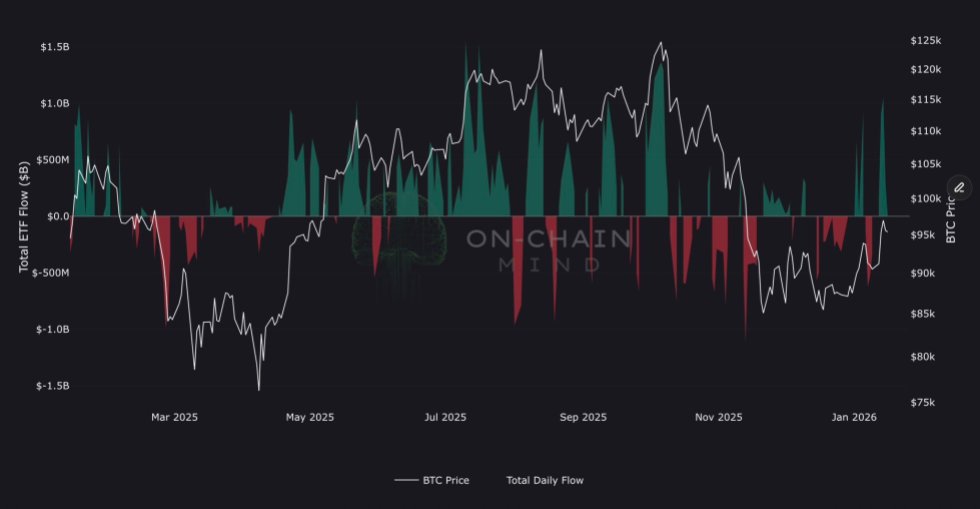 According to the On-Chain Mind, a Bitcoin and crypto data analyst, this renewed demand among institutional investors is observed in the Exchange-Traded Funds (ETFs) field. Specifically, the behavior, which is significant for the market, is outlined on the Total ETF Flow metric.