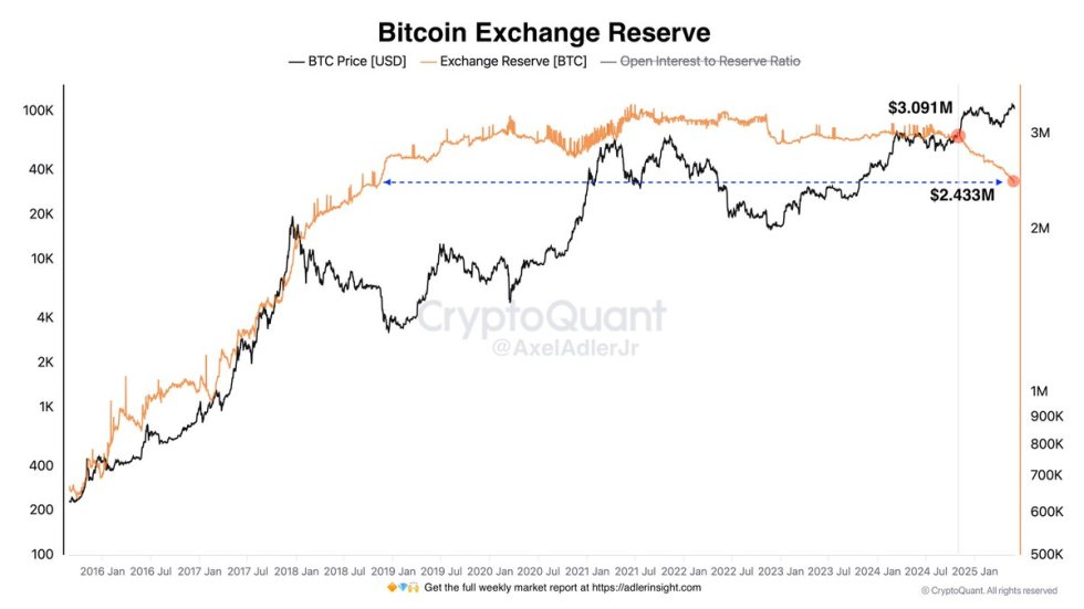Still, on-chain data offers a glimmer of long-term optimism. According to top analyst Axel Adler, centralized exchange (CEX) reserves have fallen by 668,000 BTC since November 2024. This notable decline signals reduced selling pressure and increased confidence among long-term holders. However, it’s premature to declare reserves depleted. As of now, there are still 2,432,989 BTC available across exchanges.