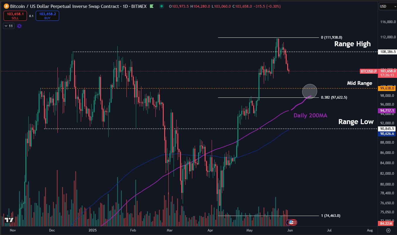 In a brief X post on May 31, Daan Crypto has shared a cautious outlook on Bitcoin amidst an ongoing price correction. The analyst notes that if the retracement persists into June, Bitcoin is likely to fall to around $97,000 -$99,000 at which it may find a credible market resistance.