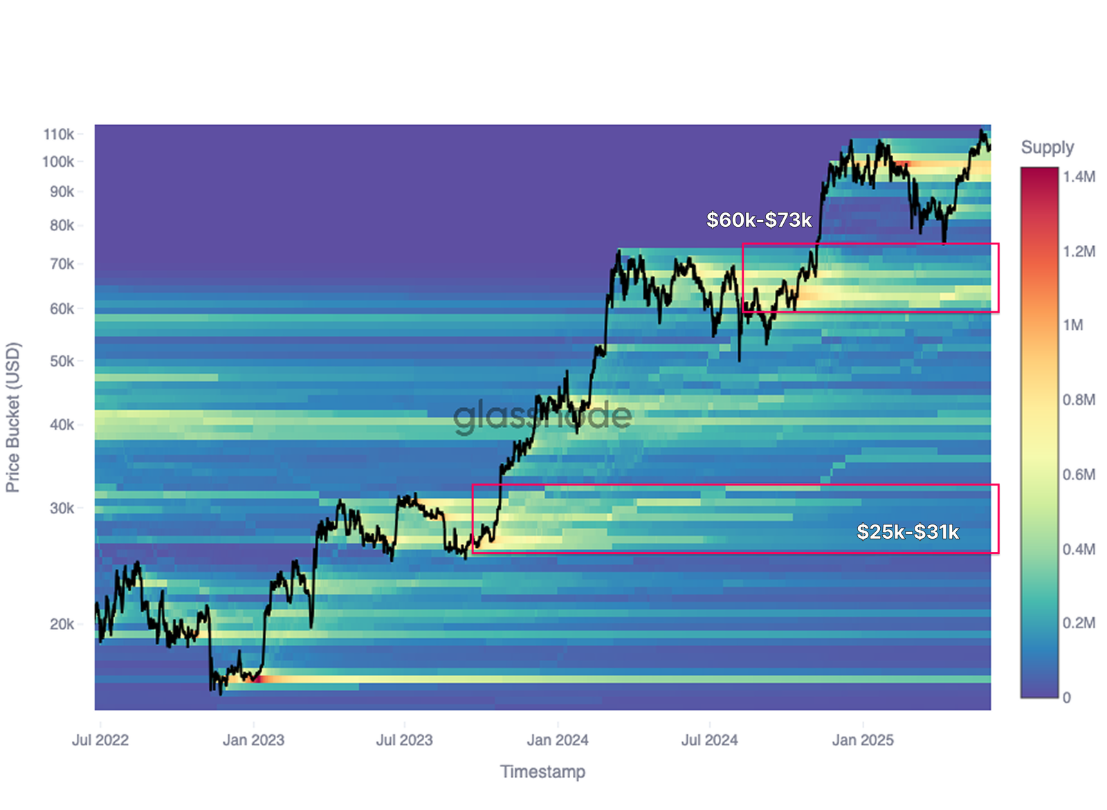 The most notable selling pressure has come from cohorts who accumulated during key historical ranges: $25k–31k and $60k–73k.