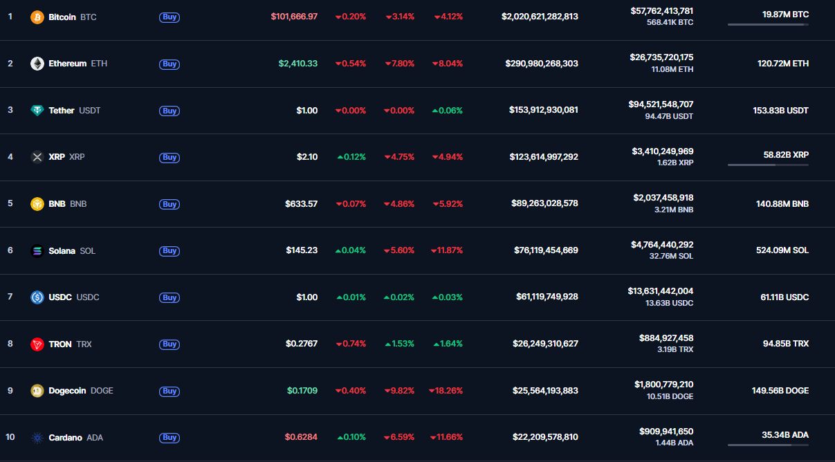 Prices across the board are down, with most major cryptocurrencies in the red. Bitcoin lost more than 3 per cent in the past day, currently trading at US$101,650 (AU$156,507).