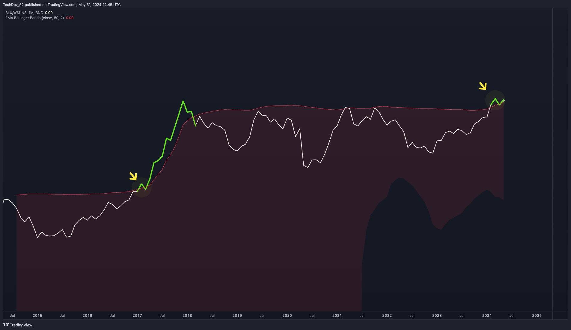 Pseudonymous analyst TechDev tells his 452,600 followers on the social media platform X that the Bitcoin versus M1 money supply chart just breached the resistance of the exponential moving average Bollinger Bands on the monthly chart.