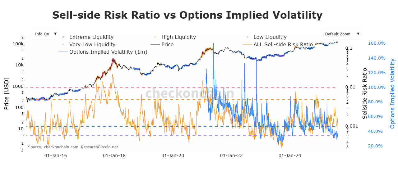 A combination of low IV and low Sell Side Ratio implied that Bitcoin was in low liquidity and lower volatility, where holders lack significant pressure to sell.