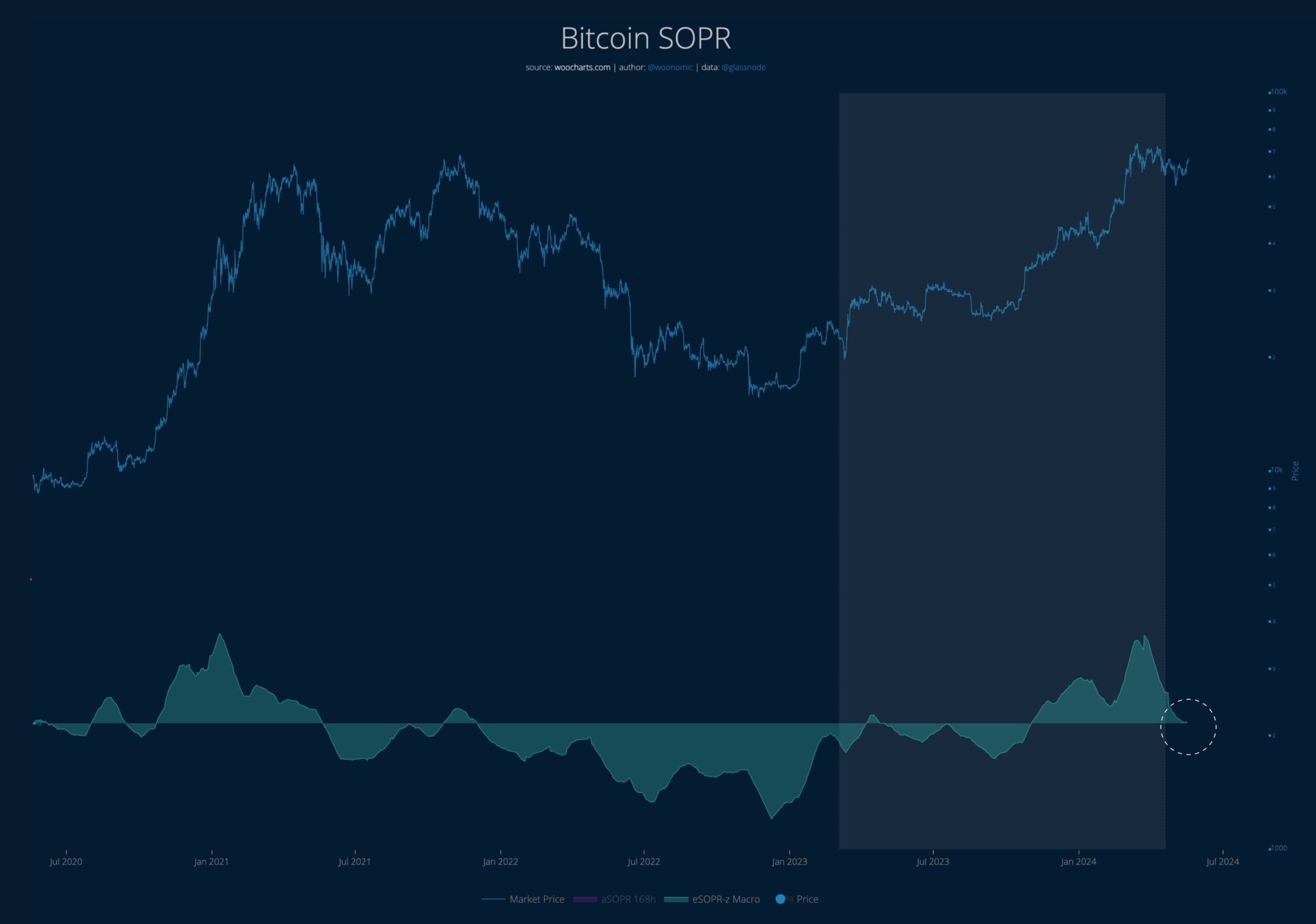 Woo tells his 1.1 million followers on the social media platform X that he’s looking at Bitcoin’s spent output profit ratio (SOPR), which tracks whether coins are being sold at a profit or loss.