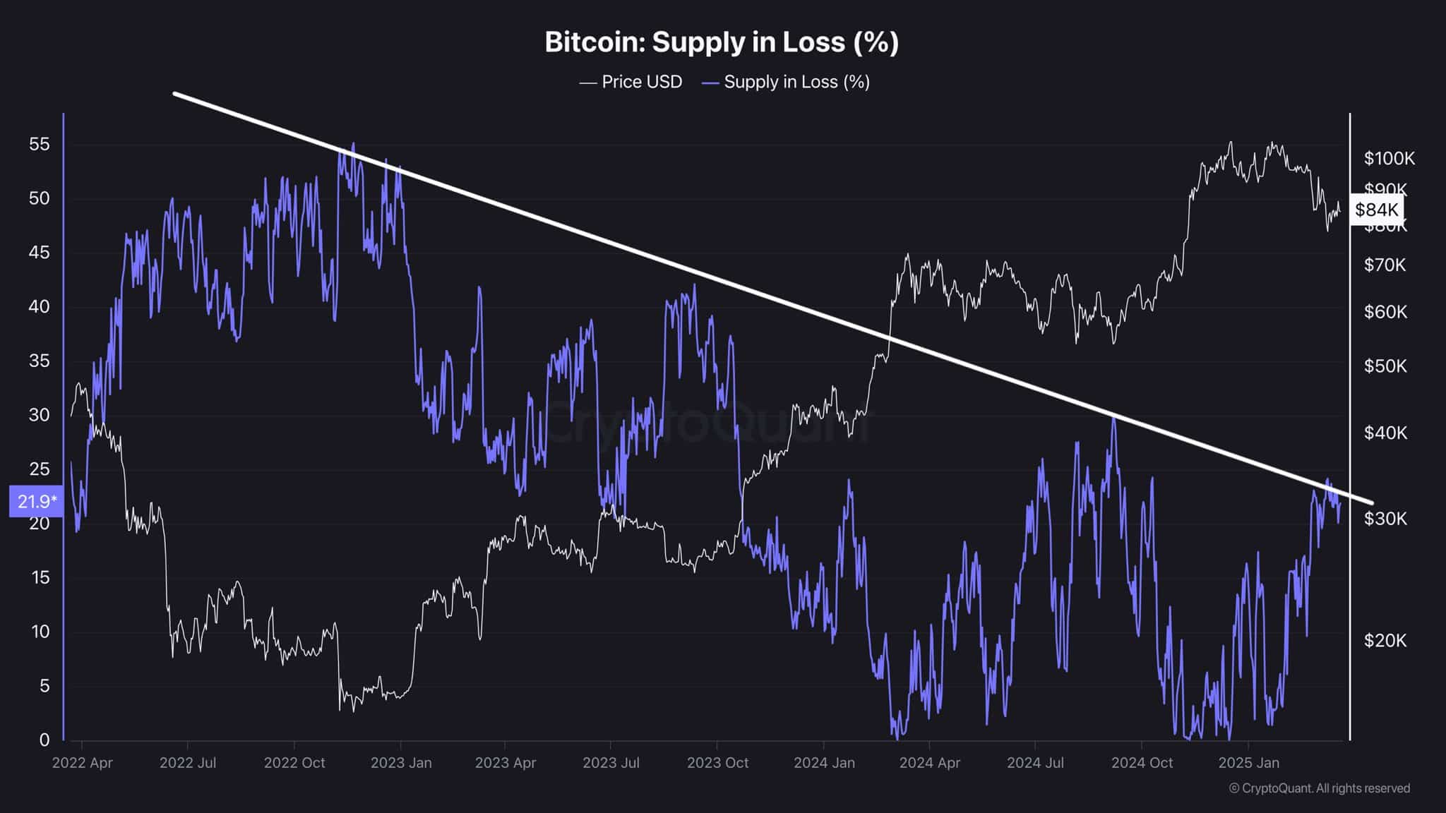 In early 2022, the supply in loss peaked at 21.9% as Bitcoin dropped below $20K, reflecting strong selling pressure during a bearish phase.