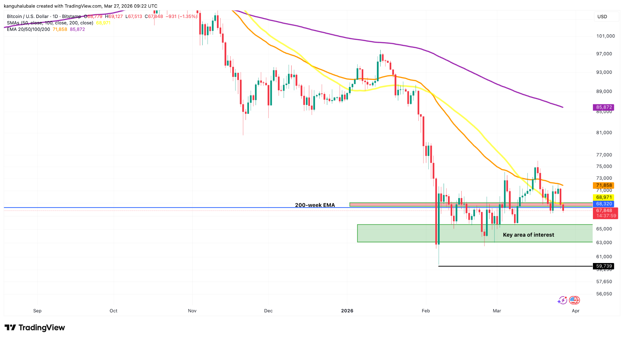 The BTC/USD pair was trading below $67,000 at the time of writing, below the 50-day simple moving average (SMA) and the 200-week exponential moving average (EMA).