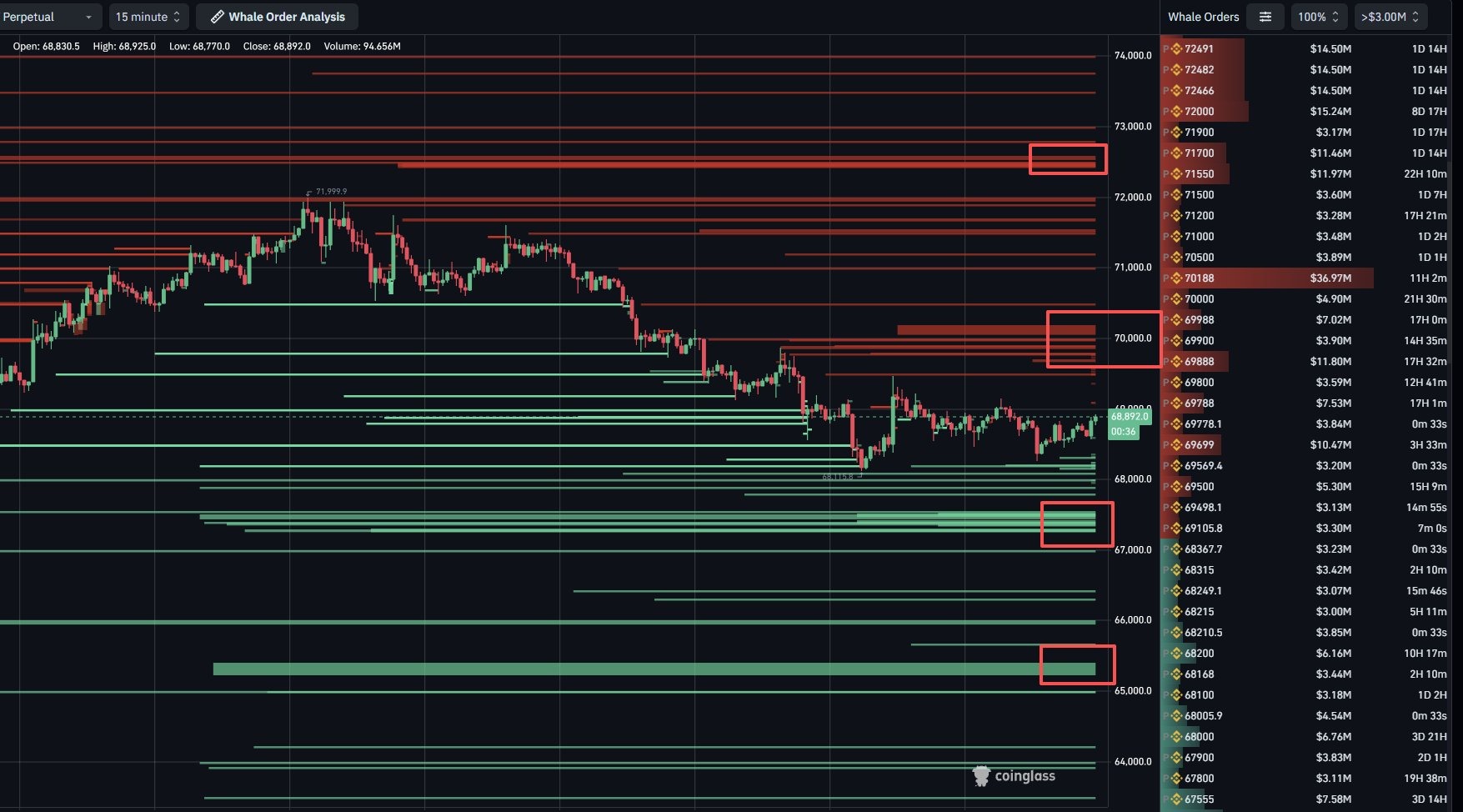 The Glassnode liquidity heatmap highlighted “stronger” whale bid orders near $65,000, suggesting that the BTC price could retest this area before a bounce.