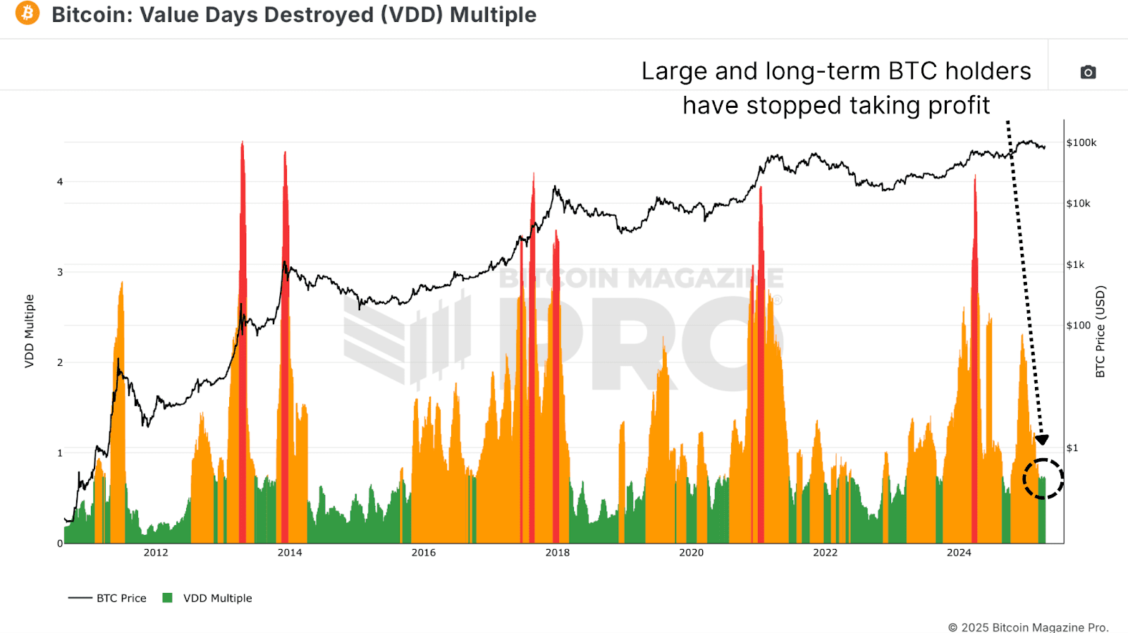 The Value Days Destroyed (VDD) Multiple, another critical on-chain indicator, tracks the velocity of BTC transactions weighted by holding periods. Spikes in VDD signal profit-taking by experienced holders, while low levels indicate Bitcoin accumulation. Currently, VDD is in the “green zone,” mirroring levels seen in late bear markets or early bull market recoveries.