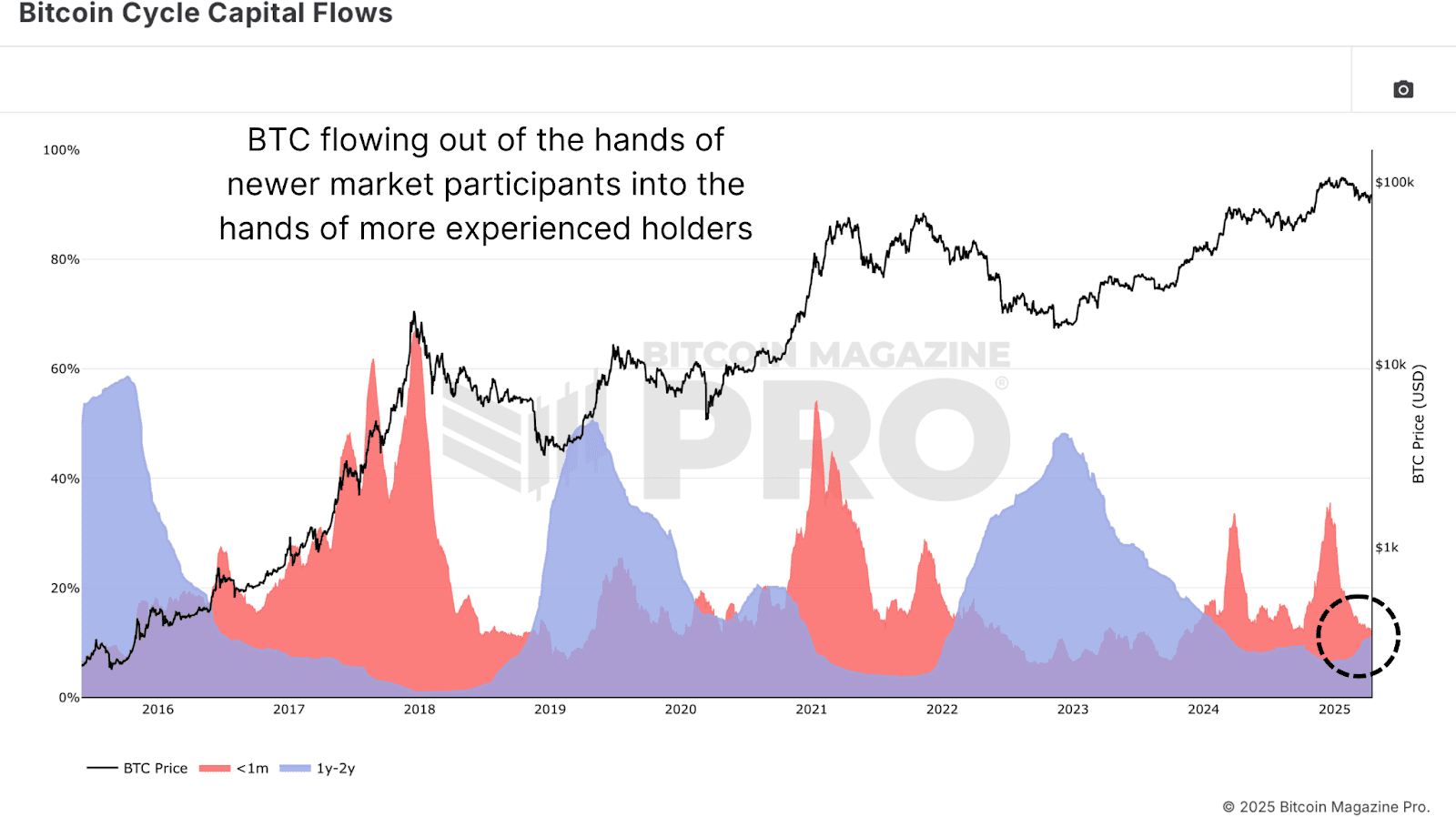 Following Bitcoin’s reversal from $100,000, the low VDD suggests the end of a profit-taking phase, with long-term holders accumulating in anticipation of higher 2025 Bitcoin prices. The Bitcoin Cycle Capital Flows chart further illuminates this trend, breaking down realized capital by coin age. Near the $106,000 peak, new market entrants (