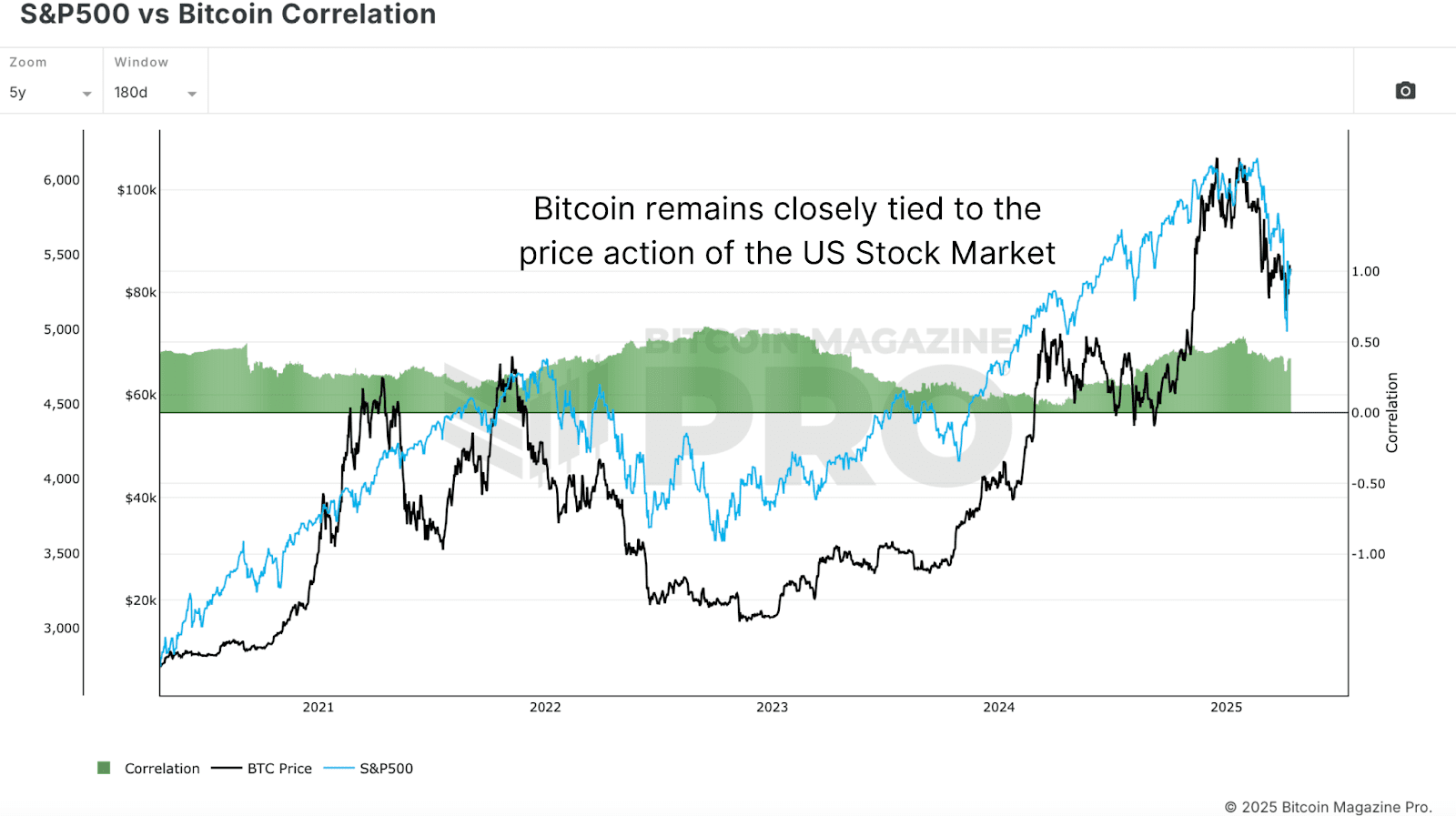 Despite bullish on-chain indicators, macro headwinds pose risks to the 2025 Bitcoin price. The S&P 500 vs. Bitcoin Correlation chart shows Bitcoin remains tightly linked to U.S. equities. With fears of a global recession growing, weakness in traditional markets could cap Bitcoin’s near-term rally potential.