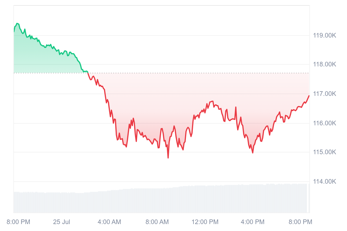 Cynthia Lummis stated that BTC’s current price is consistent with broader adoption trends. It also underscores its resilience as demand continues to rise worldwide. Currently, the Bitcoin price is $116,609, having dropped 1.67% in the last day. Its 24-hour trading volume is nearly $104 billion, up over 41%.