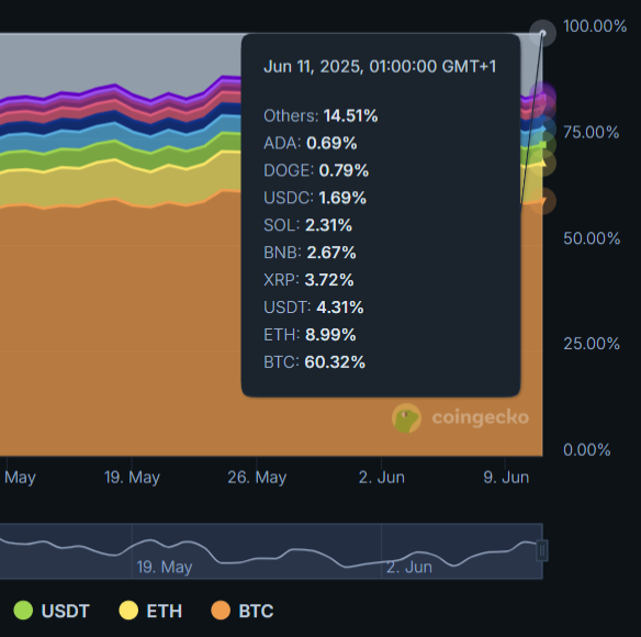 While Bitcoin and ETH continue to rally, top altcoins are moving sideways, unable to gain traction. Bitcoin dominance now sits at 60%, making it increasingly difficult for altcoins, except Ethereum, to make meaningful advances.