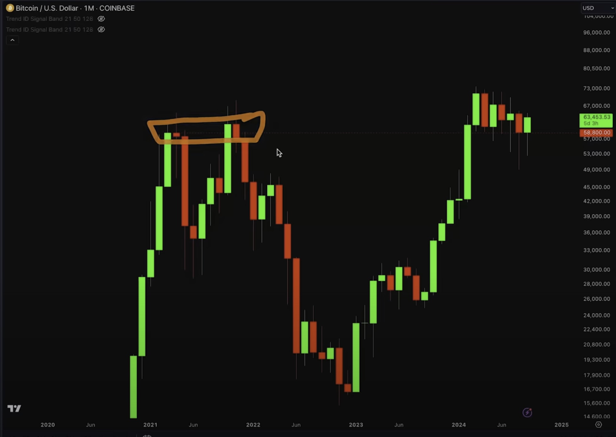 “We’re in a macro uptrend… if you take a look at the monthly line chart… we’re building support on the previous 2021 resistance. So big picture, things are looking really good. Looking at the monthly candles, you can see that we are closing our monthly candles, the market is settling up at the previous peak of the last cycle, where we settled up in the last cycle.”