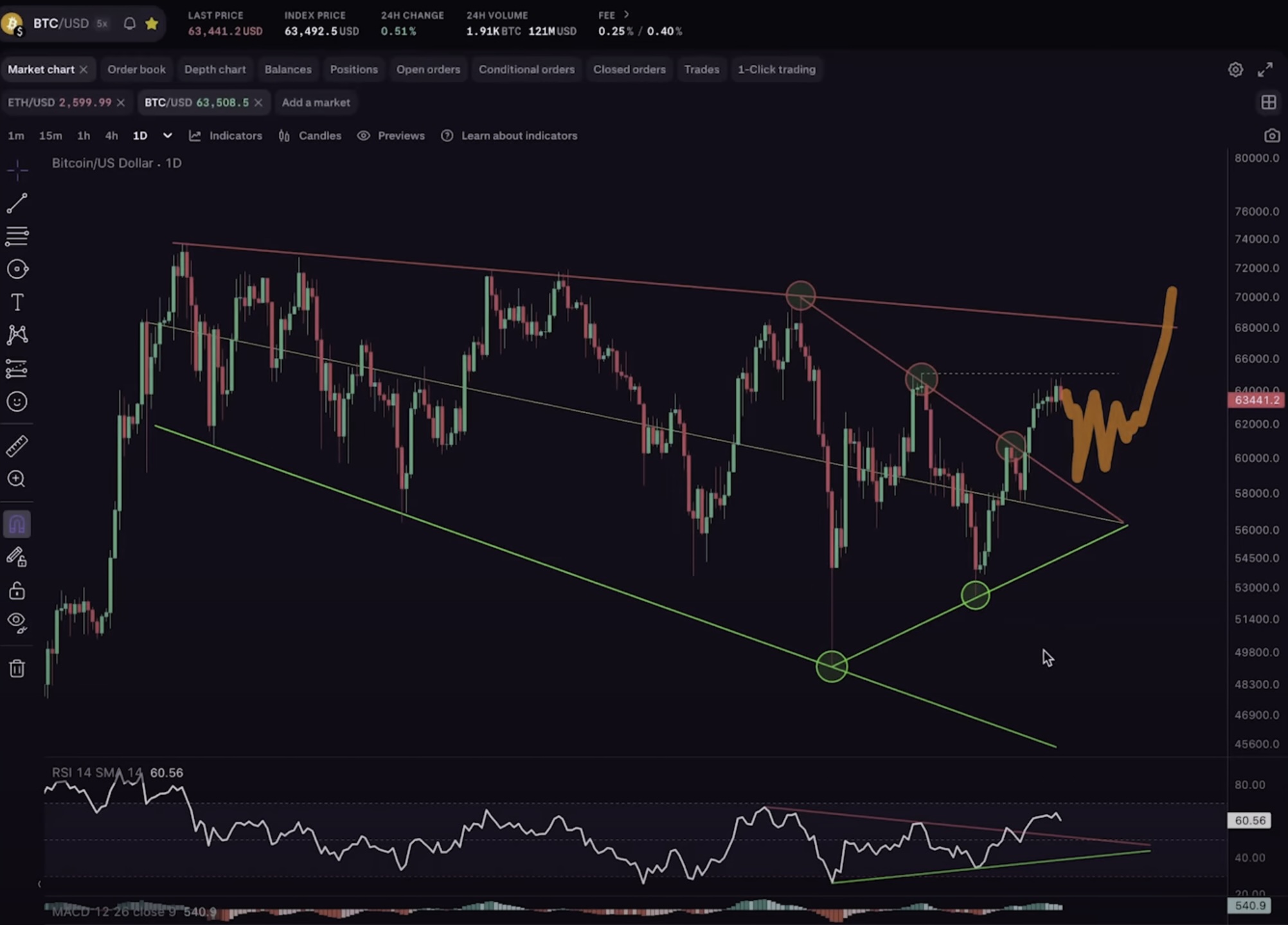 “But there is some downside risk in the short term, which would be Bitcoin retesting the breakout zone [around $58,000] and then settling up before actually getting a breakout, retesting the RSI (relative strength index) resistance as new support around that 50 level before getting to overbought levels. Those types of moves are always possible and shouldn’t be discounted. But in the long term that type of a move is really nothing.”
