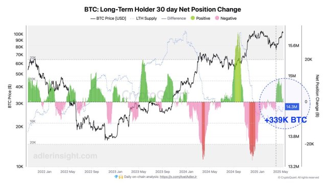 One of the most significant signals of confidence comes from the behavior of long-term holders. According to data shared by top analyst Axel Adler, since April 4, long-term holders (LTH) have added a total of 339,000 BTC to their wallets. This brings the total LTH supply to 14,370,338 BTC—a record figure that underscores deep conviction in Bitcoin’s future value.