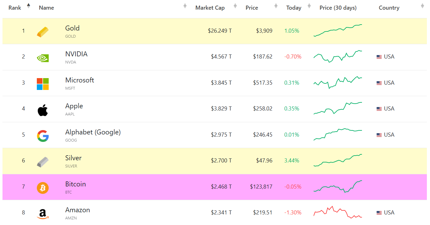 - BTC’s market cap of US$2.46 trillion makes it the seventh-largest asset globally, surpassing Amazon and trailing just behind silver, with analysts suggesting significant room for growth.