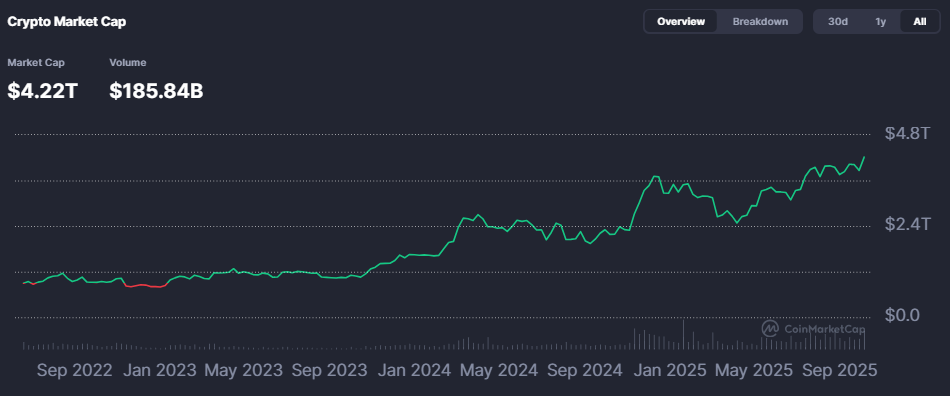 Uptober is in full swing: Bitcoin has just made a new all-time high at US$125,559 (AU$189,929) and, with it, has lifted the whole crypto market. Although sentiment seems muted – with the Fear and Greed Index at 59, or neutral – the total market cap now sits at US$4.22 trillion (AU$6.38 trillion).