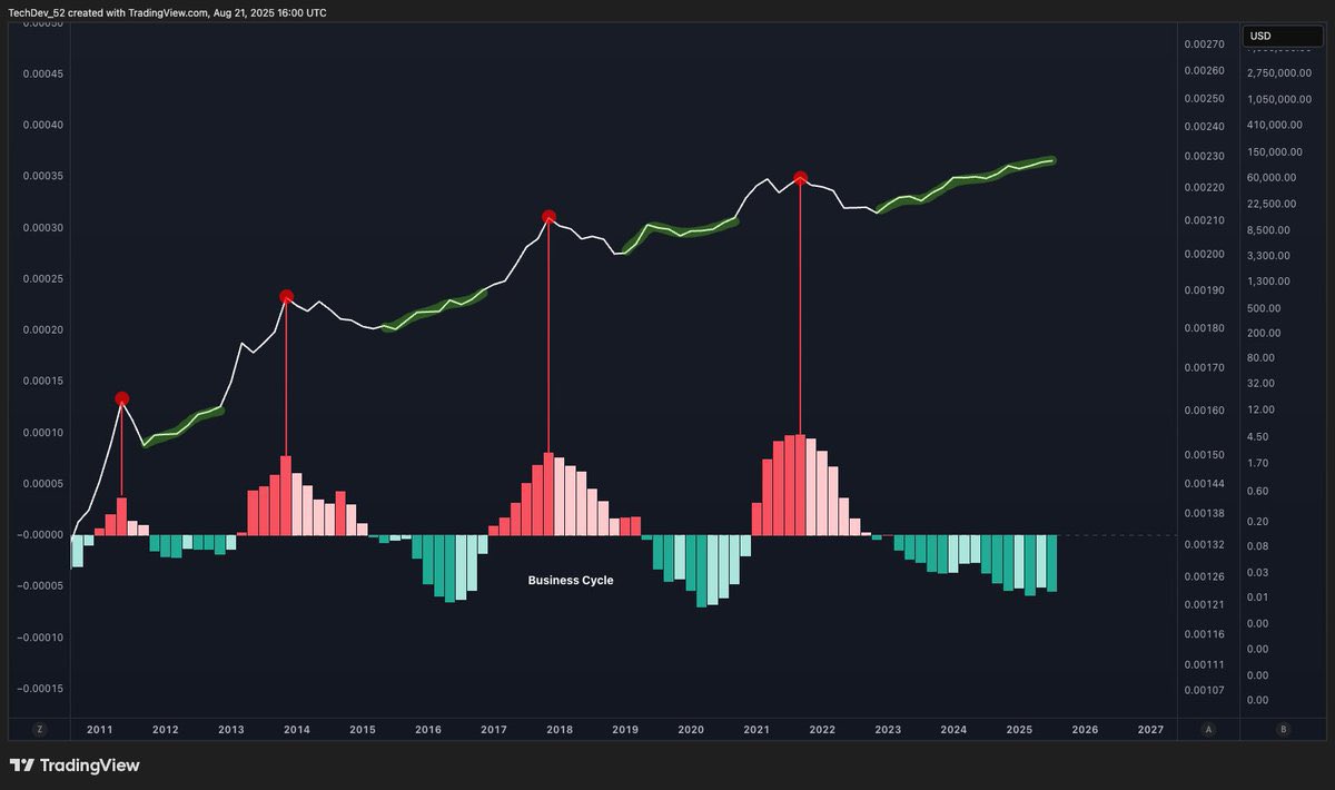 Entrepreneur “TechDev” told his 546,000 followers on X on Tuesday that “The business cycle’s dynamics are all that’s been needed to understand Bitcoin’s,” and illustrated the peaks and troughs from previous cycles.