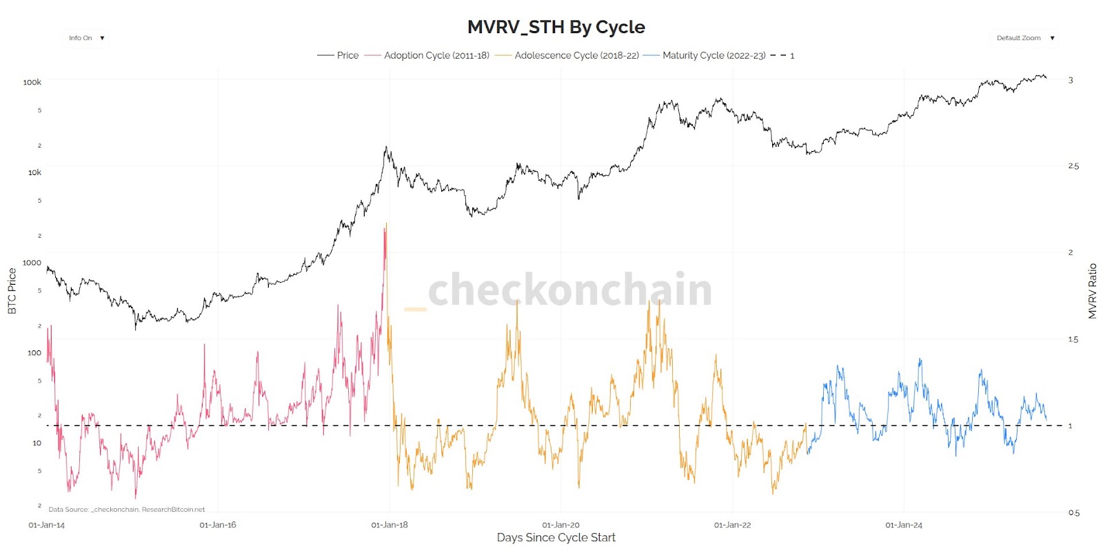 Check highlighted the three previous cycles as an “adoption cycle” from 2011 to 2018, driven by retail early adoption, an “adolescence cycle” from 2018 to 2022, driven by “Wild West boom and bust with leverage,” and the current “maturity cycle” from 2022 onward, driven by “institutional maturity and stability.”