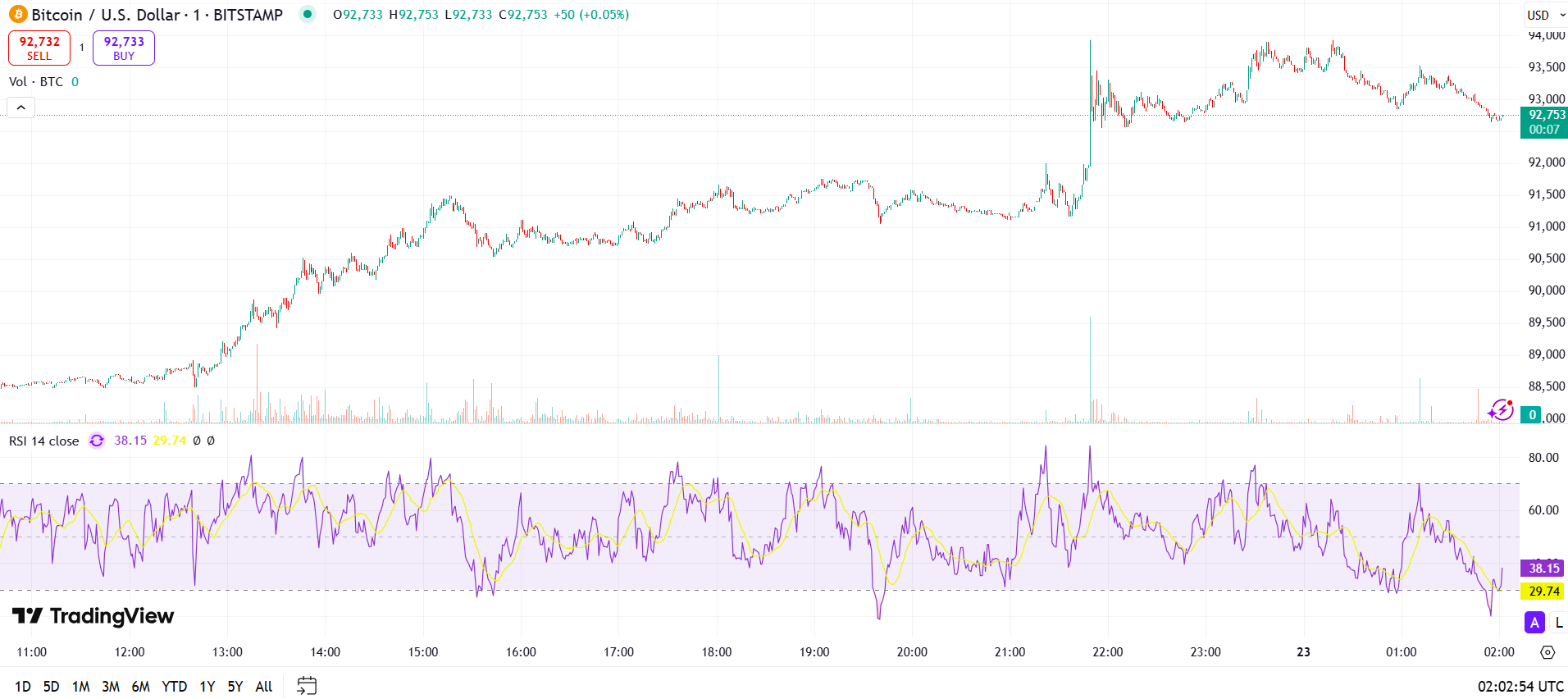 After hitting $93,900, Bitcoin has retreated to $92,700 at press time, up nearly 5% in the last 24 hours.