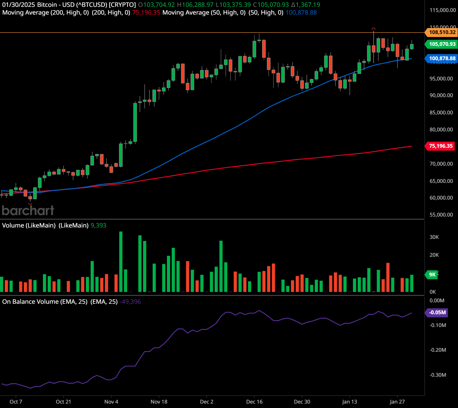 This chart shows Bitcoin’s price action on a daily timeframe. The price currently sits at $105,070.93, with the 50-day moving averageThe concept of moving averages dates back to the early 20th century. While it is challenging to attribute the invention of moving averages to a single individual, W. P. Hamilton, a… at $100,878.88 and the 200-day moving averageThe concept of moving averages dates back to the early 20th century. While it is challenging to attribute the invention of moving averages to a single individual, W. P. Hamilton, a… at $75,196.35. Key observations and technical analysis are as follows:
