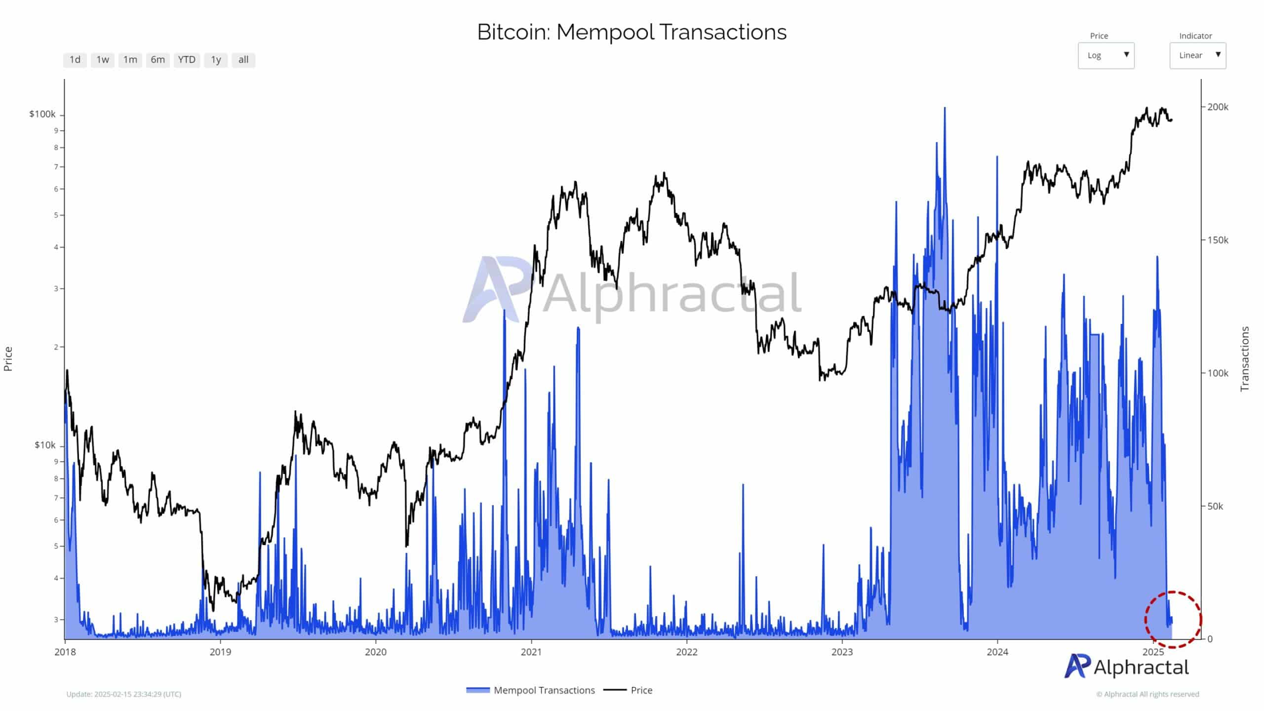 The Bitcoin mempool, which tracks unconfirmed transactions, has fallen to its lowest level in years, signaling reduced network demand.