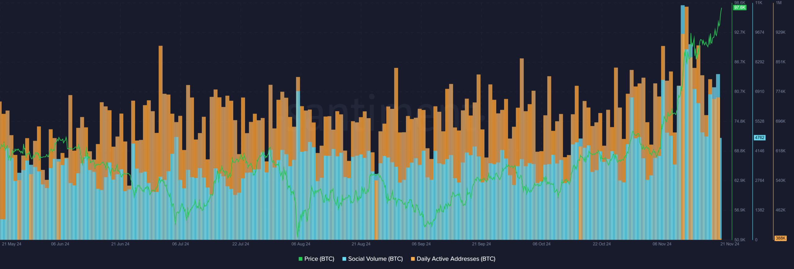 BTC’s daily active addresses have surpassed 476K, indicating consistent network growth. Simultaneously, social volume remained elevated at 388K, reflecting strong market engagement.
