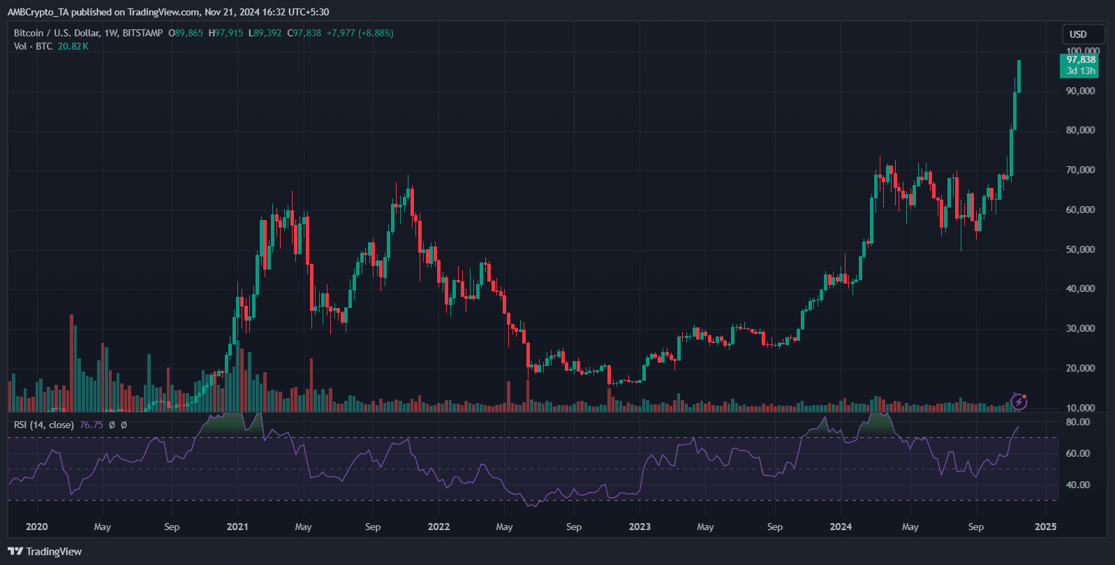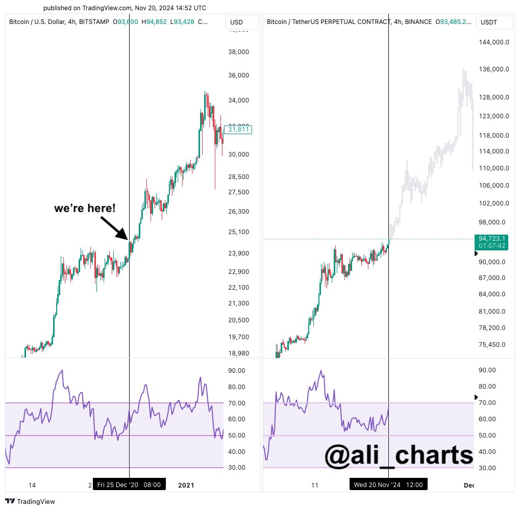 The current Bitcoin price action mirrored the December 2020 breakout, with both periods showcasing consistent higher highs and steady RSI levels that reflect increasing bullish momentum.