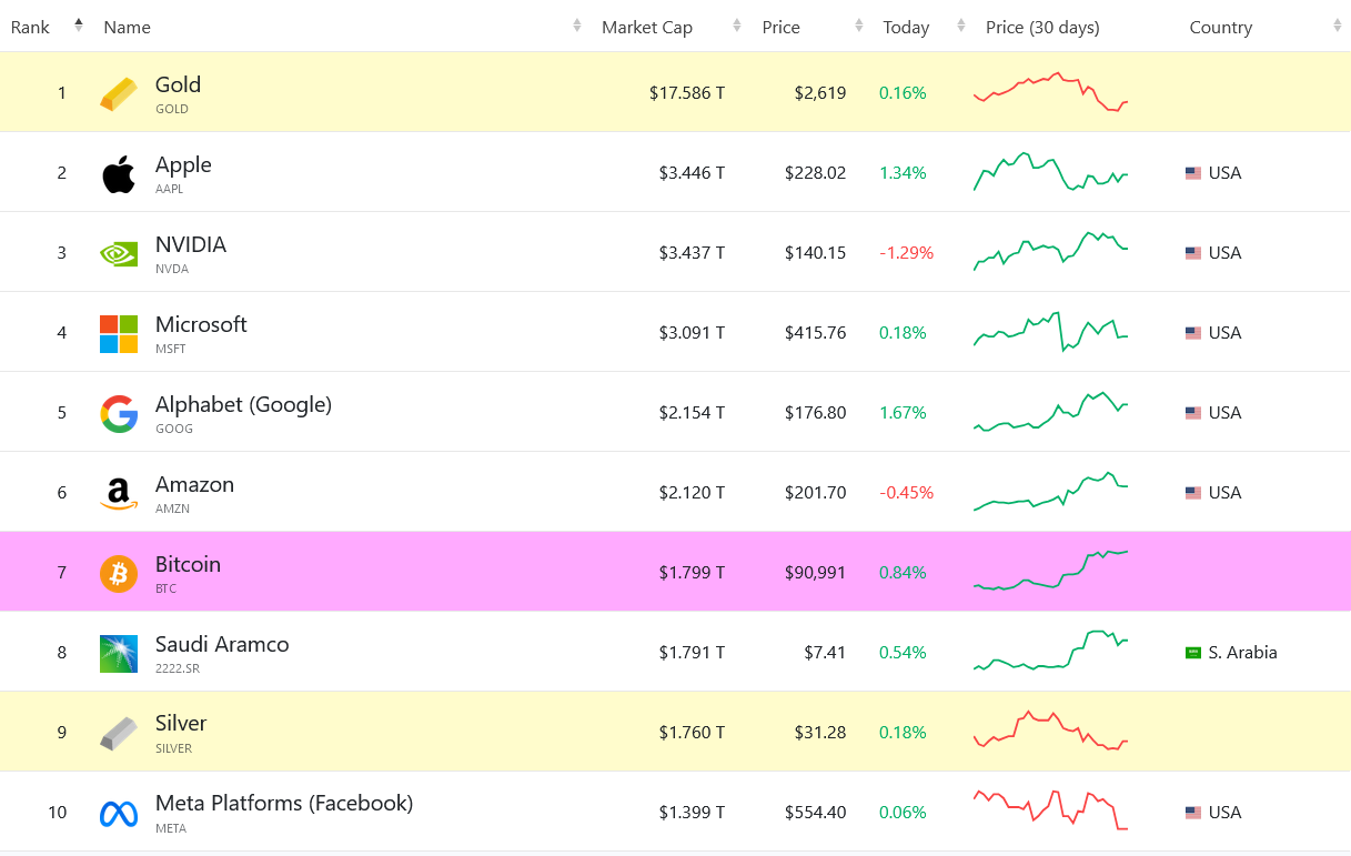 Unfazed by memecoins, Bitcoin has just recently climbed the ladder of leading world assets. Following new all-time highs, BTC has just moved to seventh spot on the global asset ranking, leaving Saudi Aramco and silver in the dust.