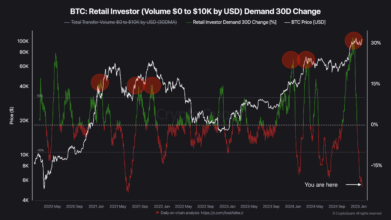 In a CryptoQuant Quicktake post, an analyst has discussed about the latest trend in the 30-day change of the Bitcoin Retail Investor Demand, which is an on-chain indicator that, as its name suggests, calculates the demand for the cryptocurrency that’s present among the retail investors.