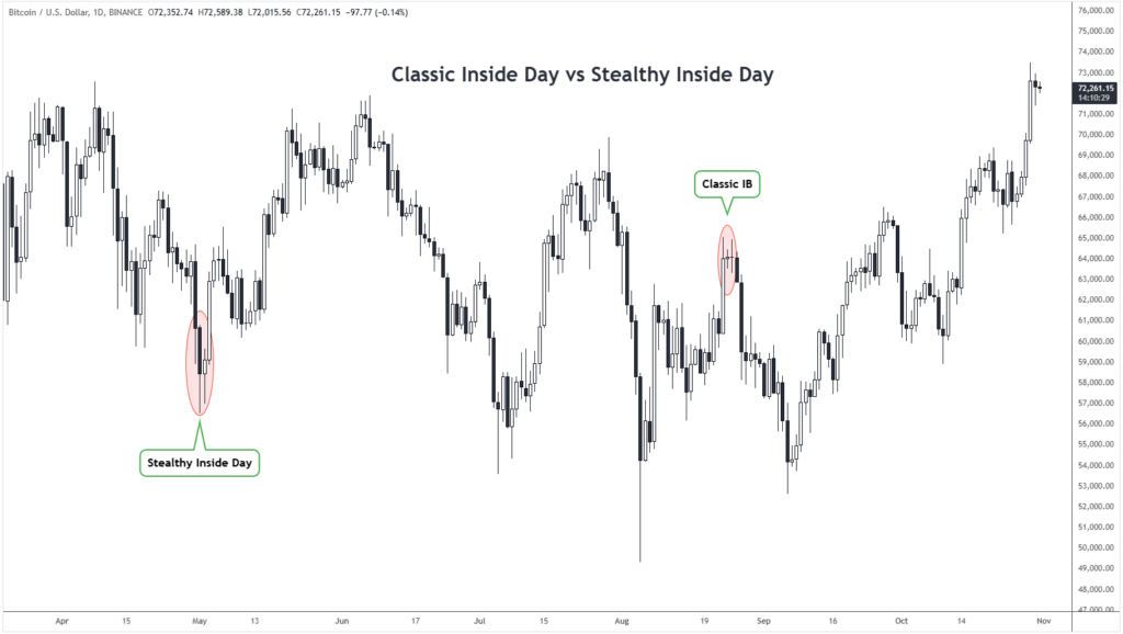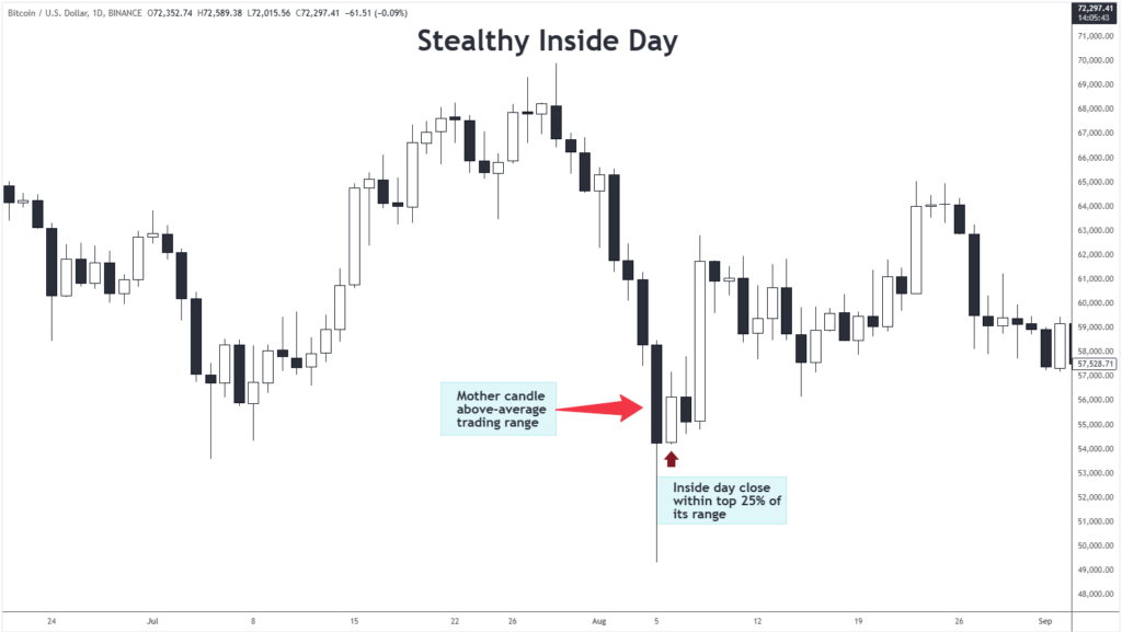 Most traders would not consider this a true Stealthy Inside Bar setup. However, if I see the inside bar close within the top or bottom 25% of its range, especially when it’s around half the mother bar’s size, I will treat it as a valid Stealthy Inside Bar Setup.