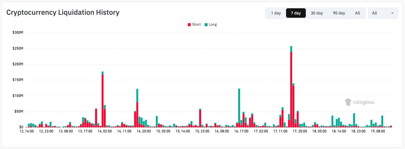 Data from CoinGlass showed long positions coming under fire during the BTC price retracement, with total crypto liquidations at $260 million over the past 24 hours.