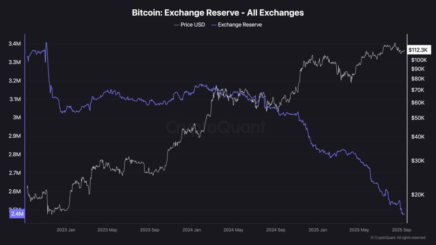 On-chain data shows Bitcoin exchange reserves declining sharply and falling to multi-year lows. This persistent outflow is odd for BTC being at all-time high prices but indicates that investors could be moving tokens into long-term storage.
