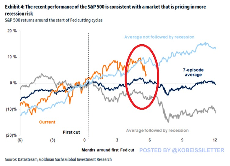 “In the case of rate cuts during a recession, the S&P 500 declined -6% in 6 months -10% within 12 months,” it continued.